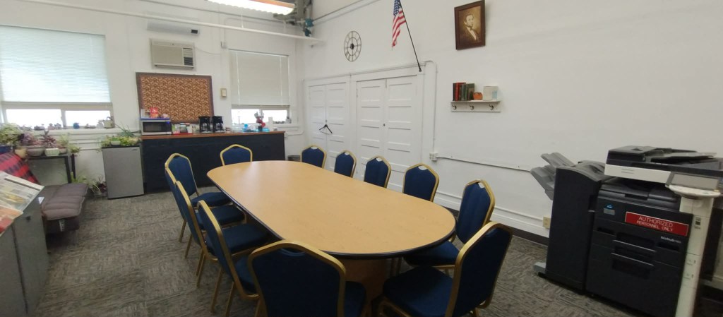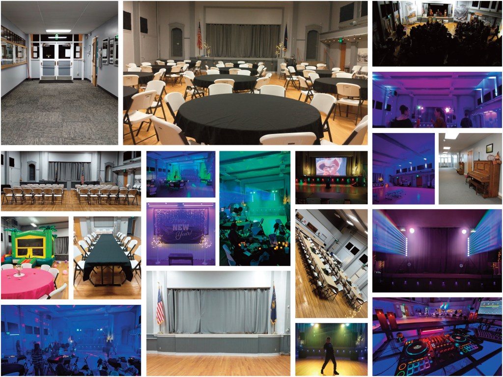 Our facility is perfect for large parties, receptions, and private events. The Auditorium is the heart of our facility, featuring high ceilings with acoustic sound paneling, original hardwood oak floors, a small stage, and attached kitchen in the back, perfect for all types of gatherings. We have customizable lighting options and access to profressional audio equipment. Our facility is available for private rental for events of all types, and tables and chairs are always included in your rental if needed. We also host our own seasonal parties and public events throughout the year.